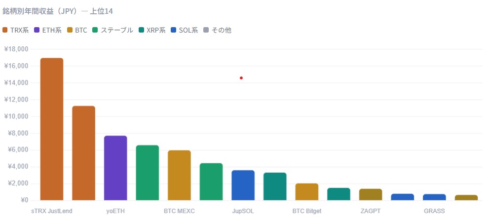 ⚠ 留意事項:① MEXC / Bitget の APR は最大値を使用(実際はフレキシブルで変動)。② GLDx-XAUt0 LP の APY は 0.5〜4% の中央値 2.25% で試算。③ YO Protocol・Doppler 等はフローティング APY のため変動あり。④ 金・RWA(ZPG / ZAGPT / ZPGAG)は価格上昇期待がリターンの主体。⑤ sTRX はアンステーク後 14 日間のロック期間あり。⑥ Pi(¥2,458)は 2027 年 8 月 5 日まで運用不可。